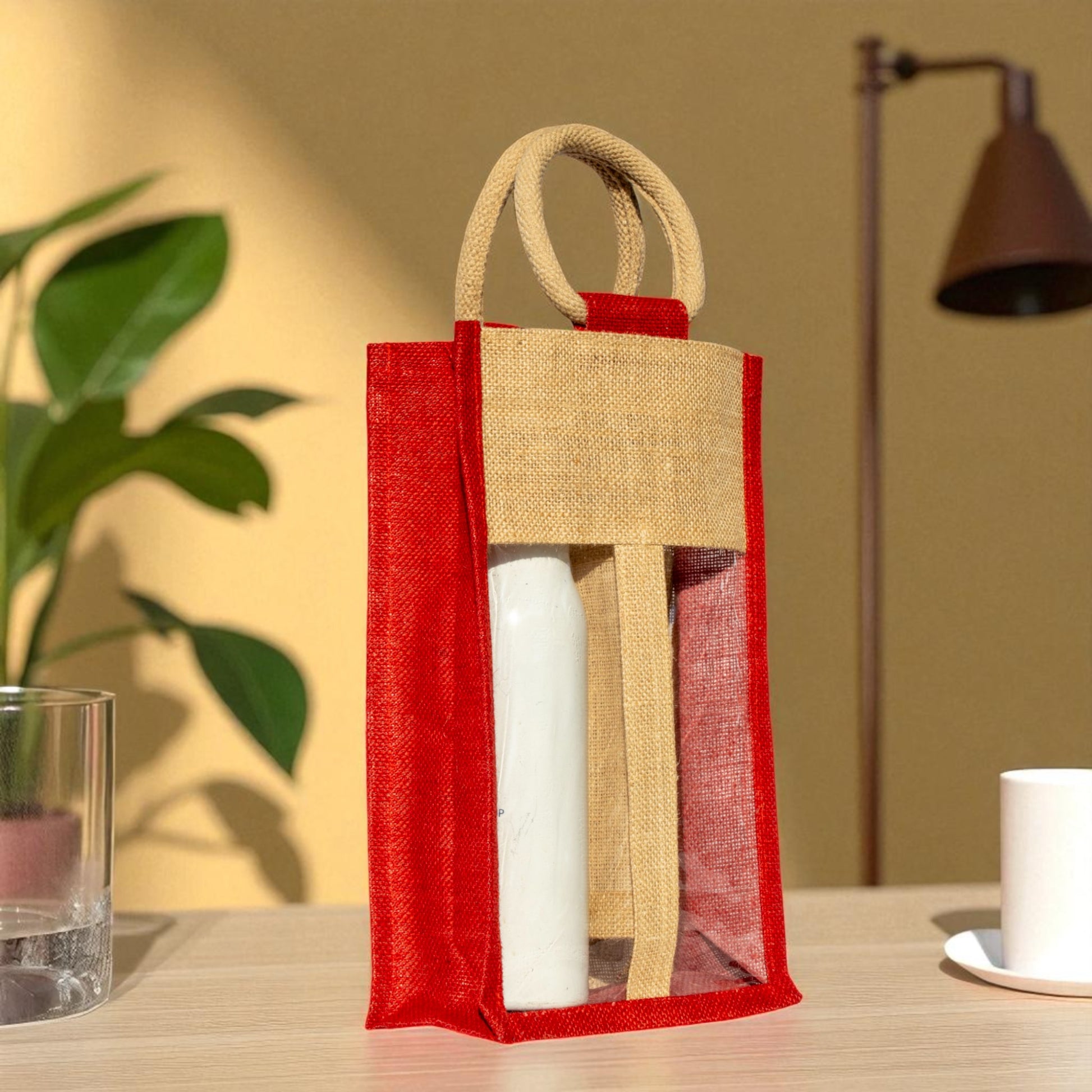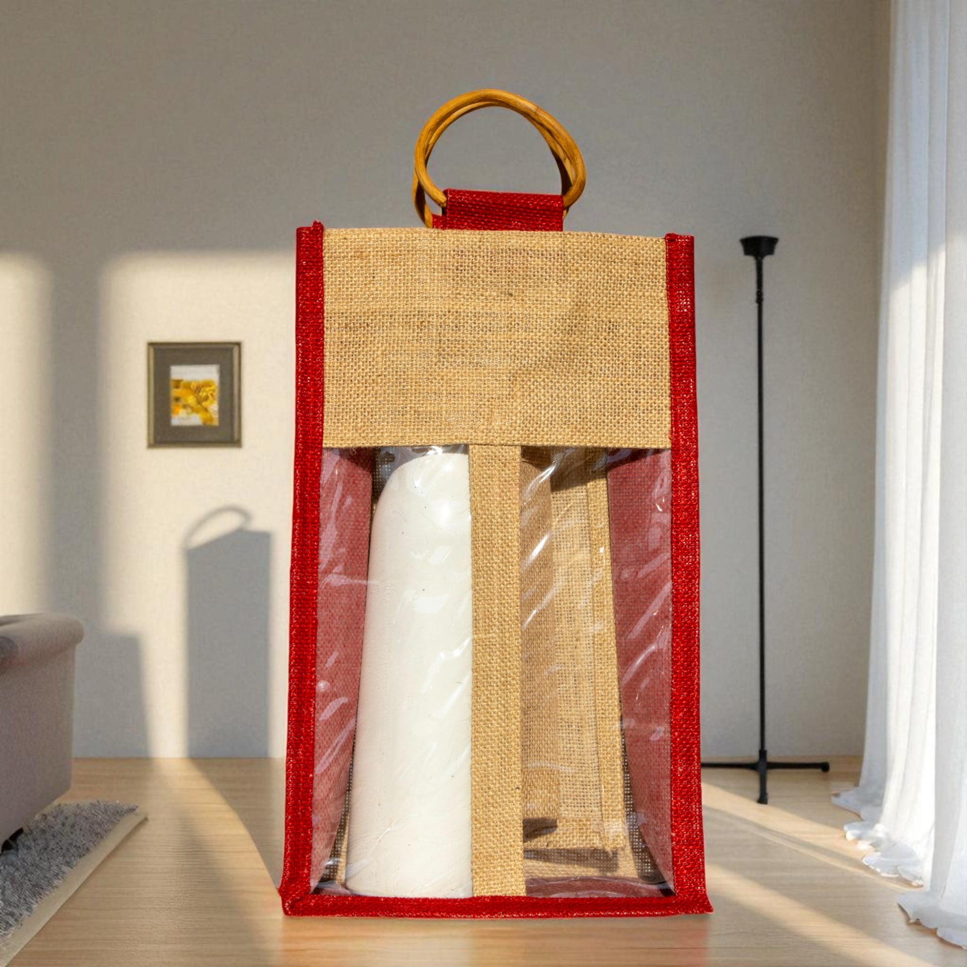 This stylish jute bottle bag from Jute Connection™ features a vibrant floral front panel and dyed black body, giving it a classy and elegant look. Crafted with eco-friendly jute and finished with sturdy cane ring handles, it's ideal for gifting or carrying bottles to parties, picnics, or events. The transparent front adds a functional and aesthetic touch.