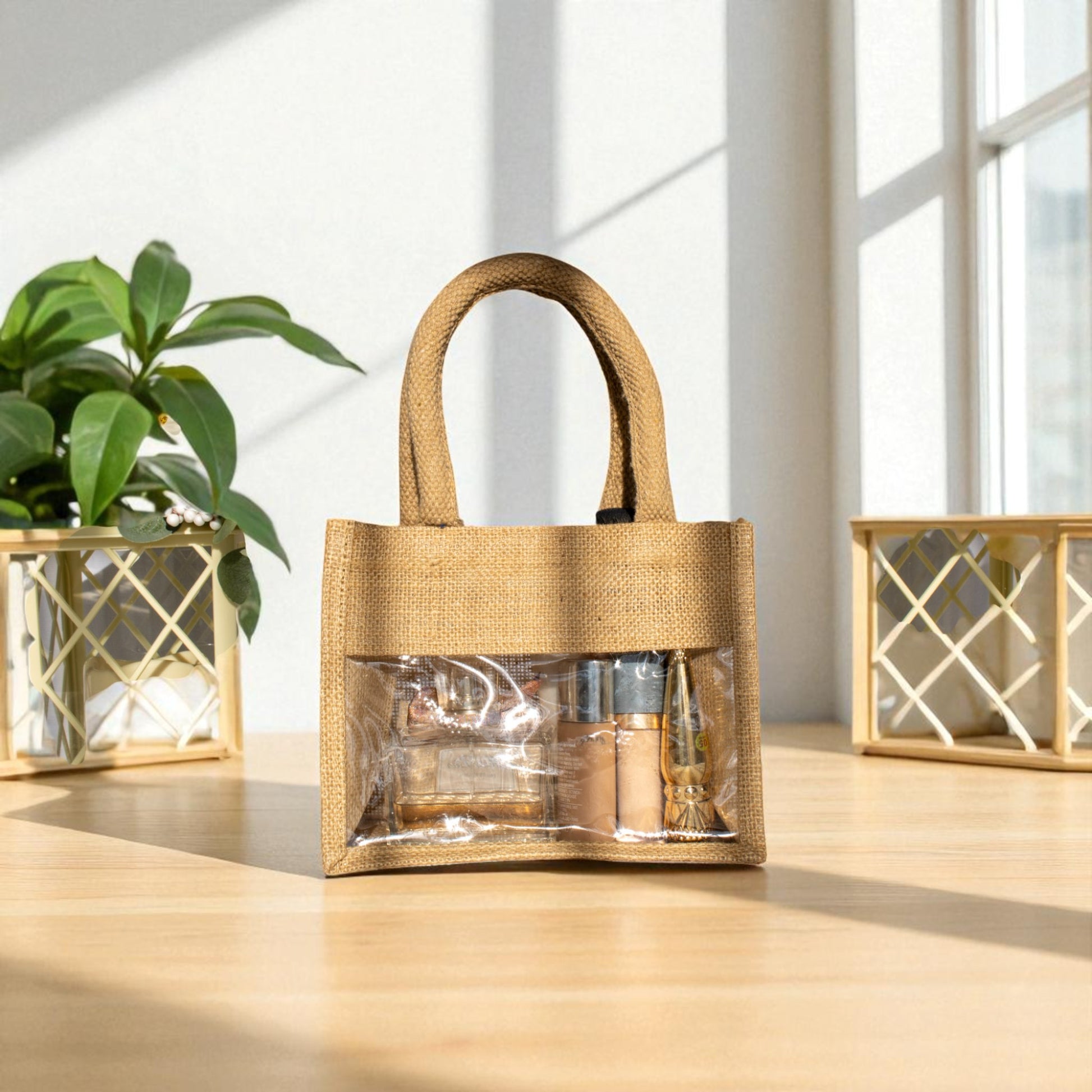 Organize your essentials in style with this compact jute pouch from Jute Connection™. Featuring a transparent front window, secure zipper closure, and sturdy rope handles, it’s perfect for travel, gifting, or everyday use. Its blend of eco-friendly design and practicality makes it an ideal sustainable choice.